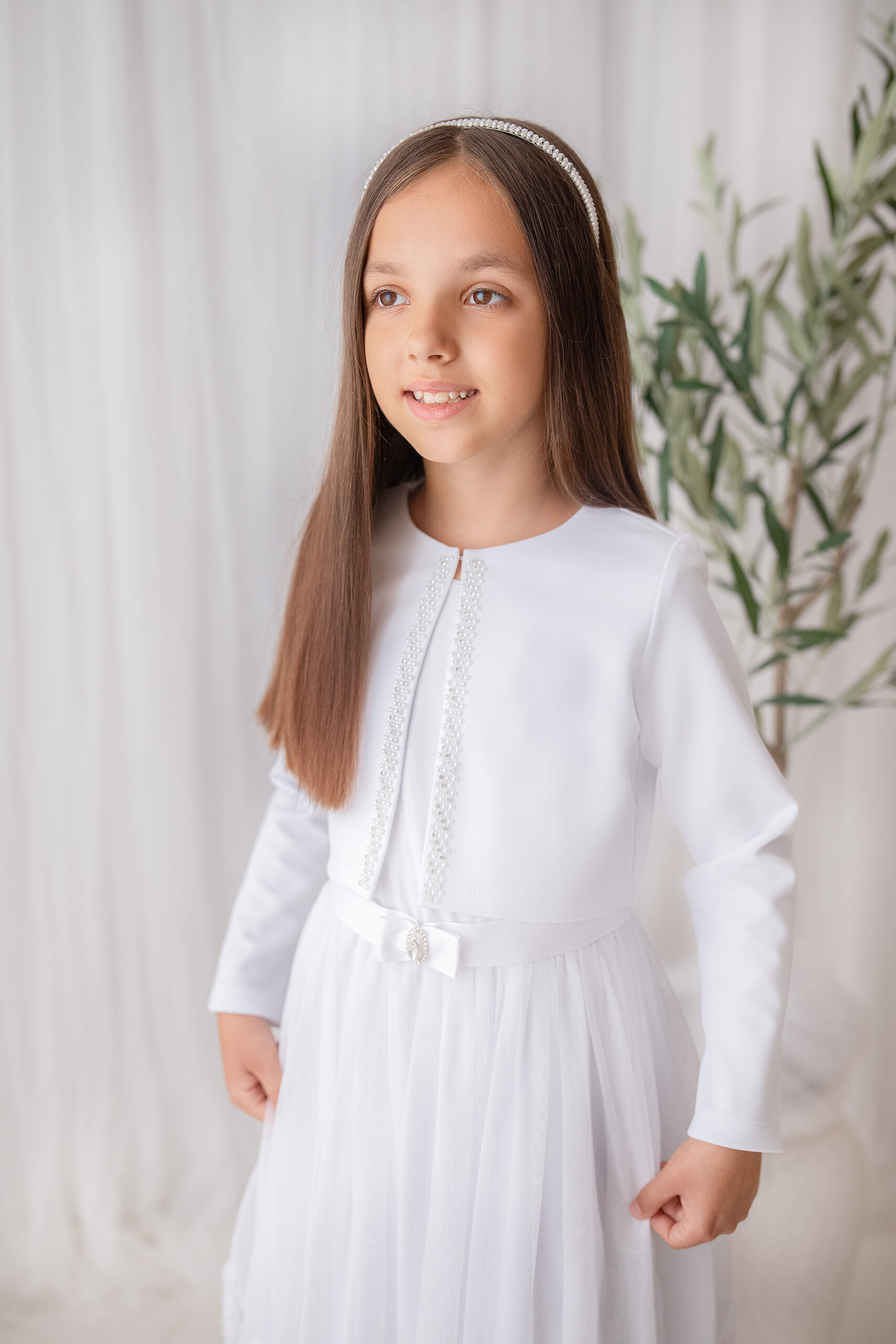 Bolerko komunijne uszyte z tkaniny dzianinowej. Ręcznie obszyte taśmą perełkową z cyrkoniami. Idealnie pasuje do alb i sukienek komunijnych.