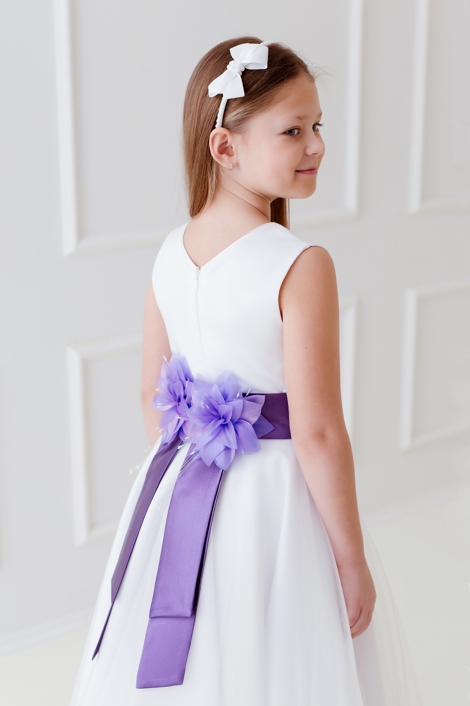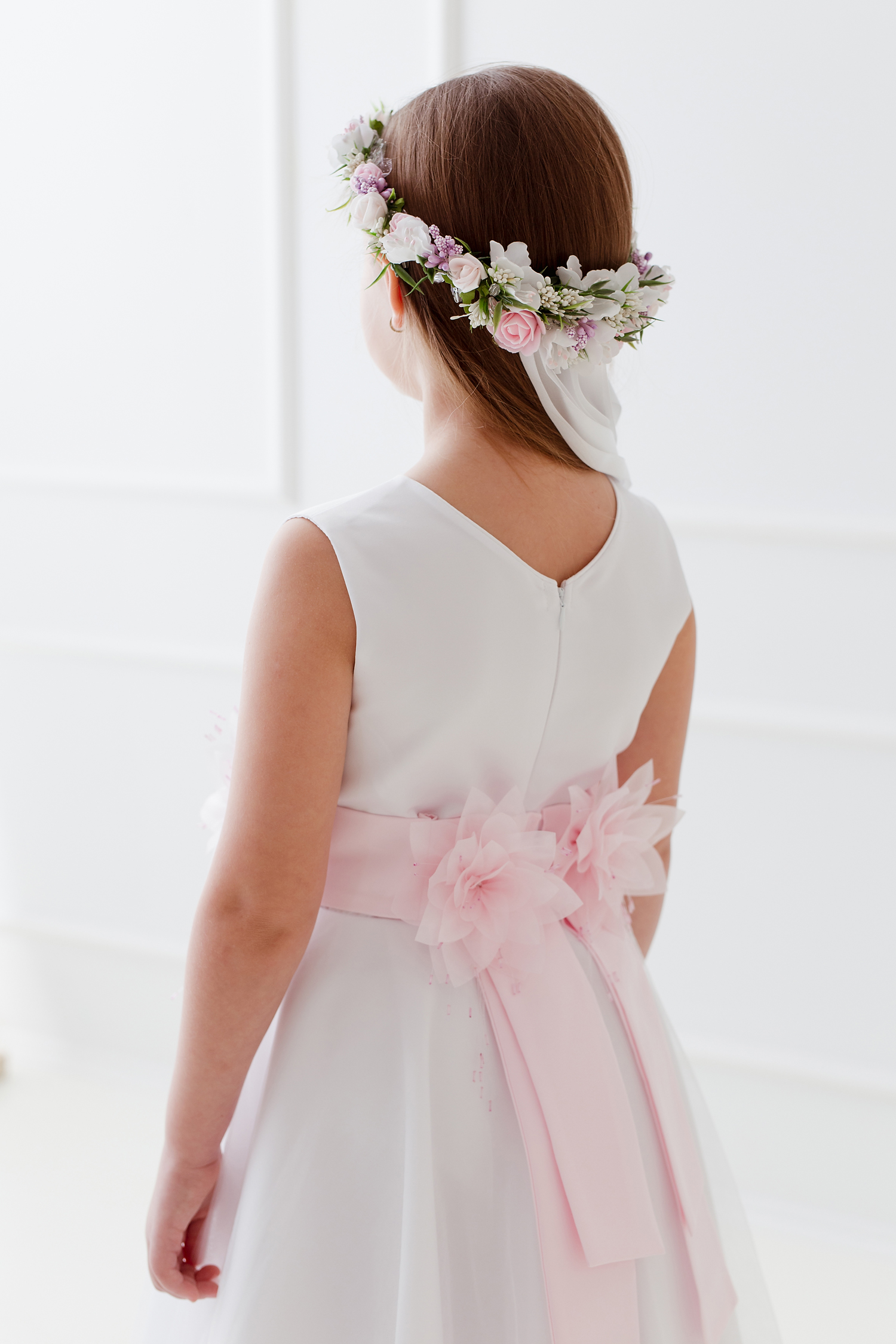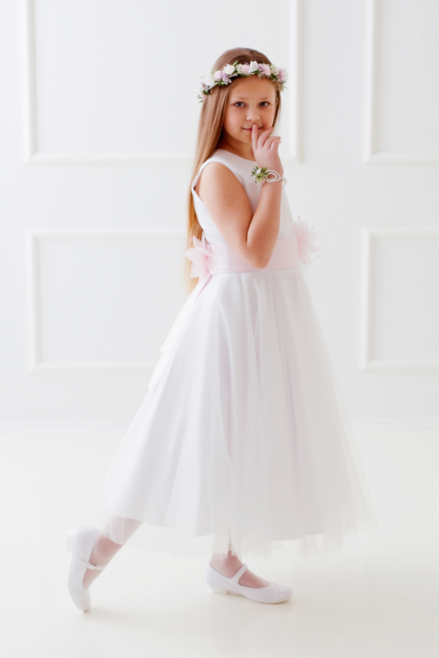 Sukienka uszyta jest ze śnieżnobiałej satyny komunijnej, półmatowej oraz tiulu. Sukienka jest na podszewce.