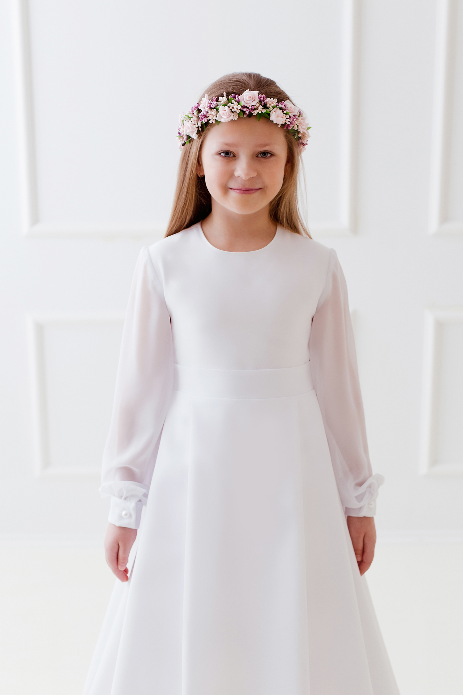 Sukienka odcinana w pasie, dół z zakładkami. Rękaw długi, szyfonowy w mankiet. Z tyłu kokarda do wywiązania. Halka z tiulem od pasa (z możliwością włożenia koła). Pod sukienkę sugerujemy założyć podkoszulek na ramiączka. Tkanina stretch oraz szyfon.