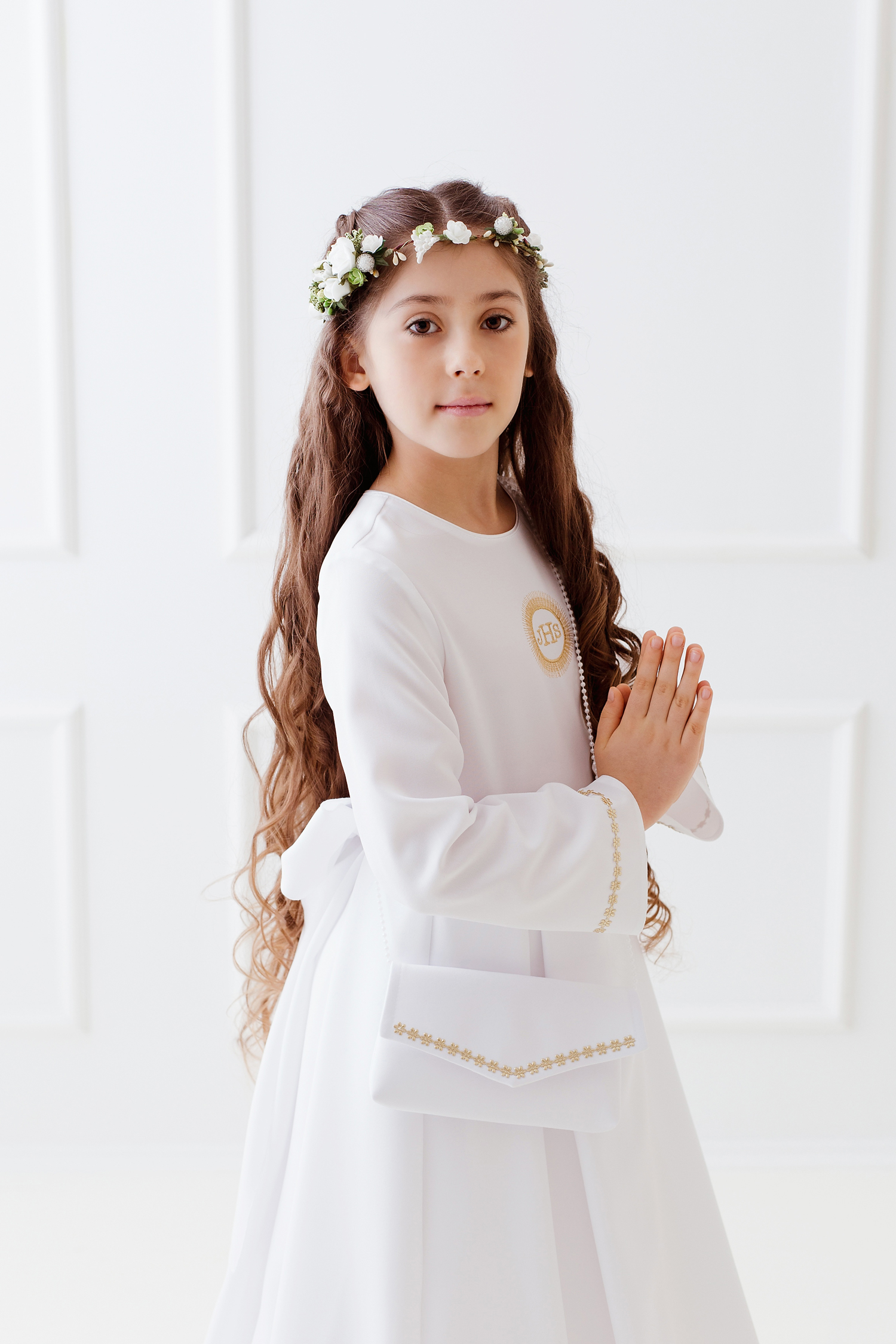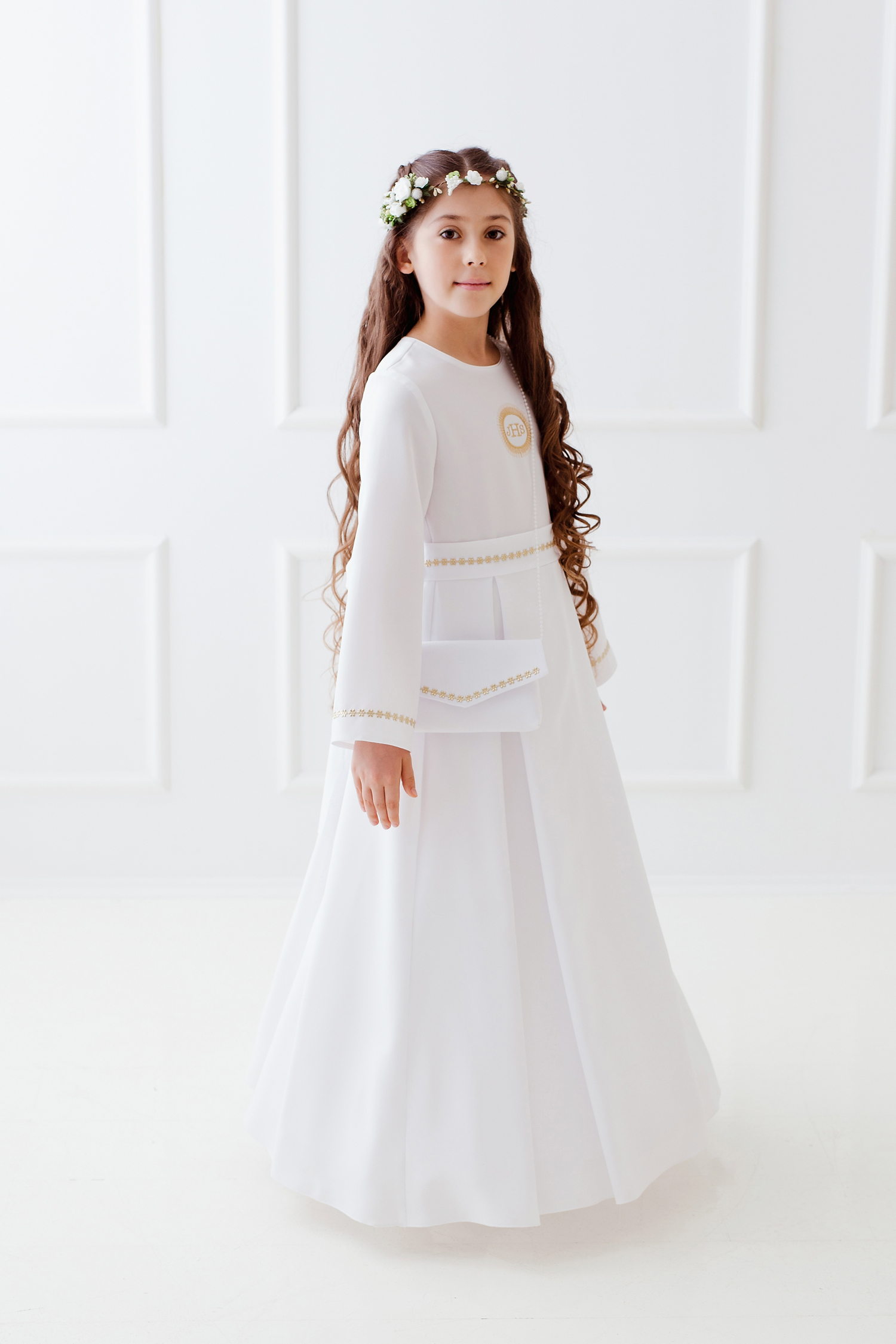 Sukienka odcinana w pasie, dół delikatne zakładki, długi rękaw. Wyhaftowana złota hostia. Rękaw oraz pasek wykończony delikatnymi złotymi kwiatkami. Z tyłu kokarda do wywiązania. Halka z tiulem od pasa (z możliwością włożenia koła). Pod sukienkę sugerujemy założyć podkoszulek na ramiączka. Hostia i kwiatki mogą być w kolorze srebra. Tkanina stretch.