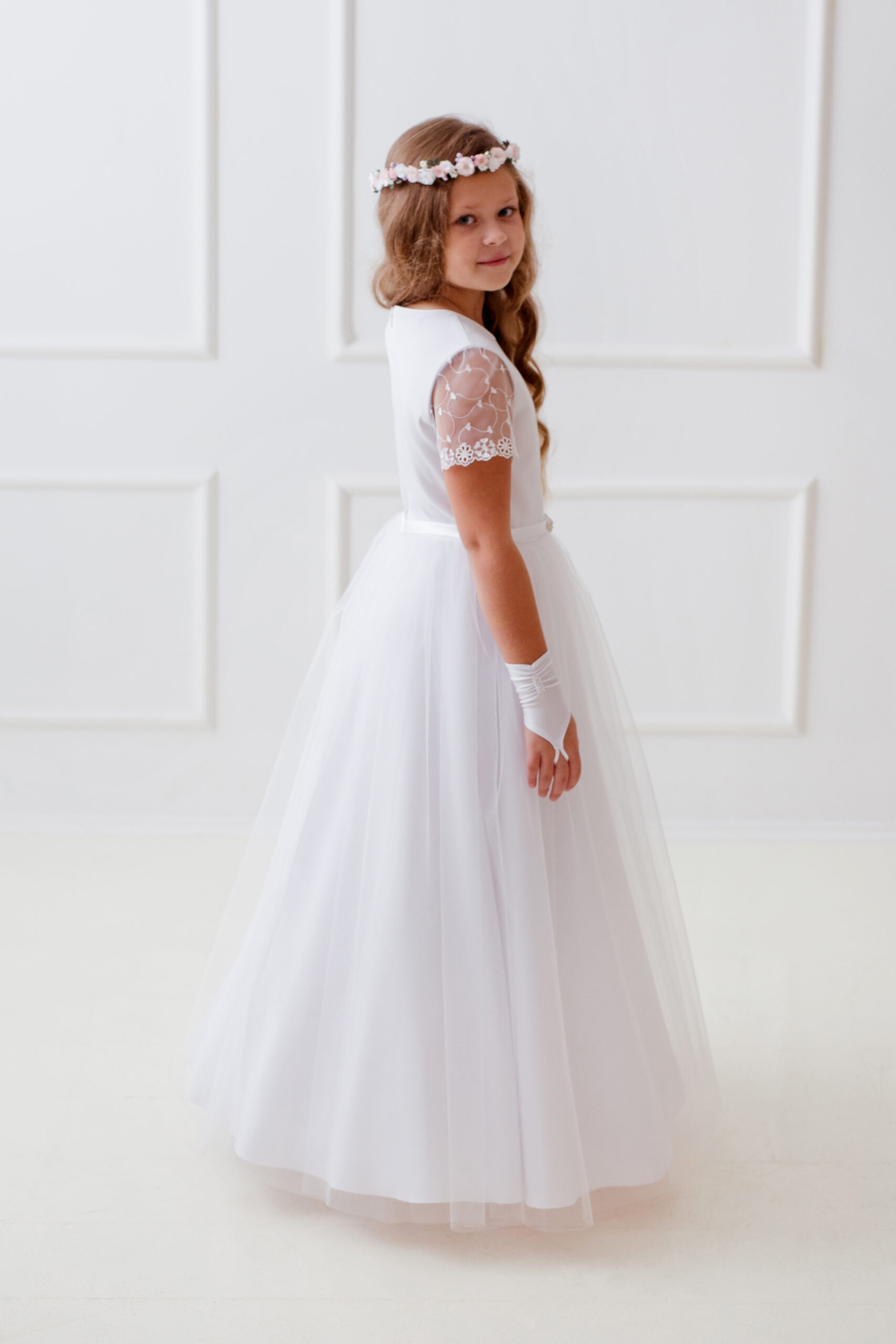 Sukienka komunijna odcinana w pasie. Góra prosta, rękawek delikatna koronka. Dół sukienki tiulowy lekko marszczony. Satynowy pasek z elegancką srebrno-złotą broszką. Sukienka zapinana na suwak, bez kokardy. Góra sukienki na podszewce. Halka z tiulem od pasa (możliwość włożenia koła). Tkanina albowa mat,tiul,koronka.