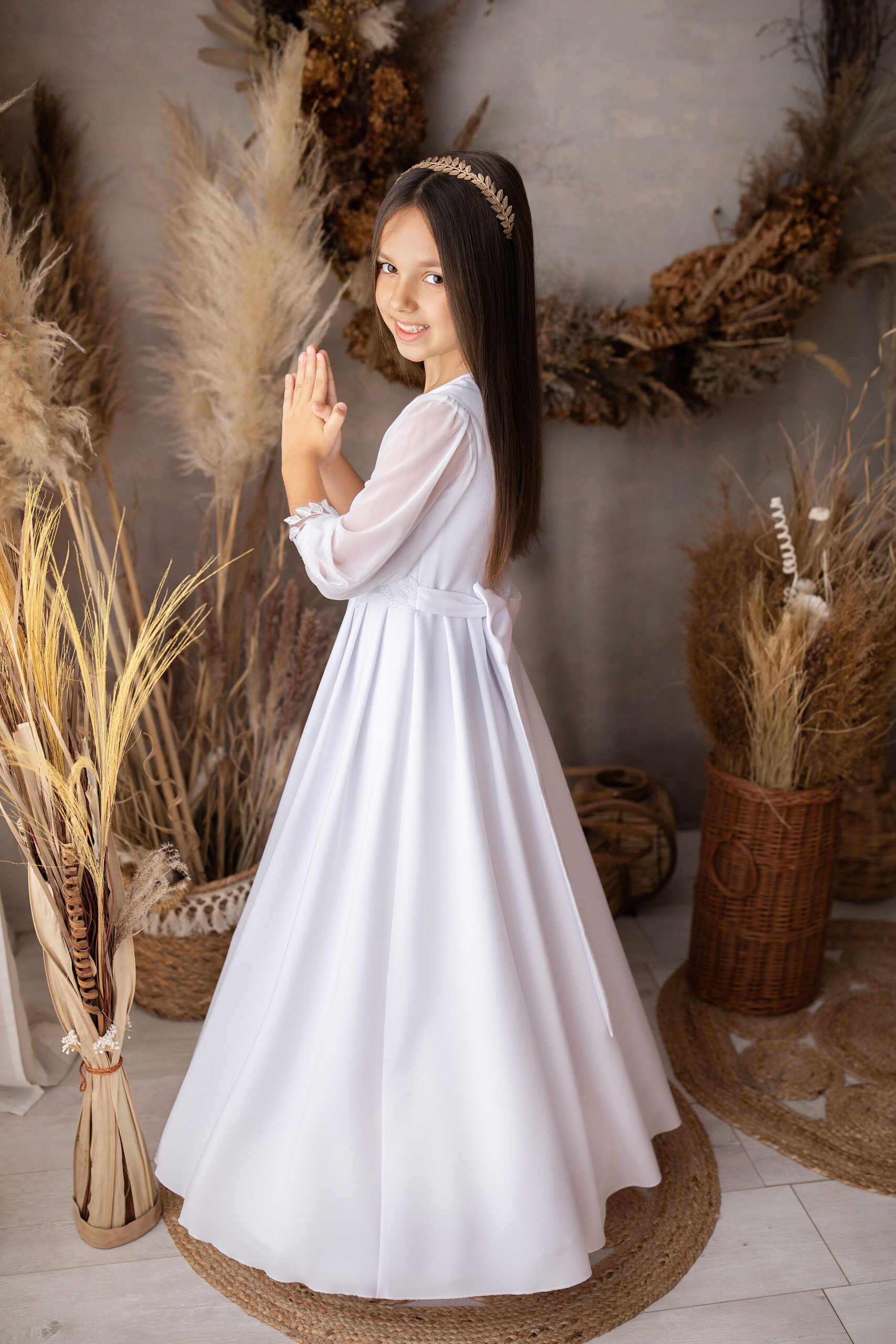 Sukienka komunijna odcinana w pasie, dół z bocznymi zakładkami. W pasie i na rękawkach ozdobna taśma w kształcie listków. Sukienka zapinana na suwak, z tyłu kokarda. Halka z tiulem wszyta od pasa (z możliwością włożenia koła).
