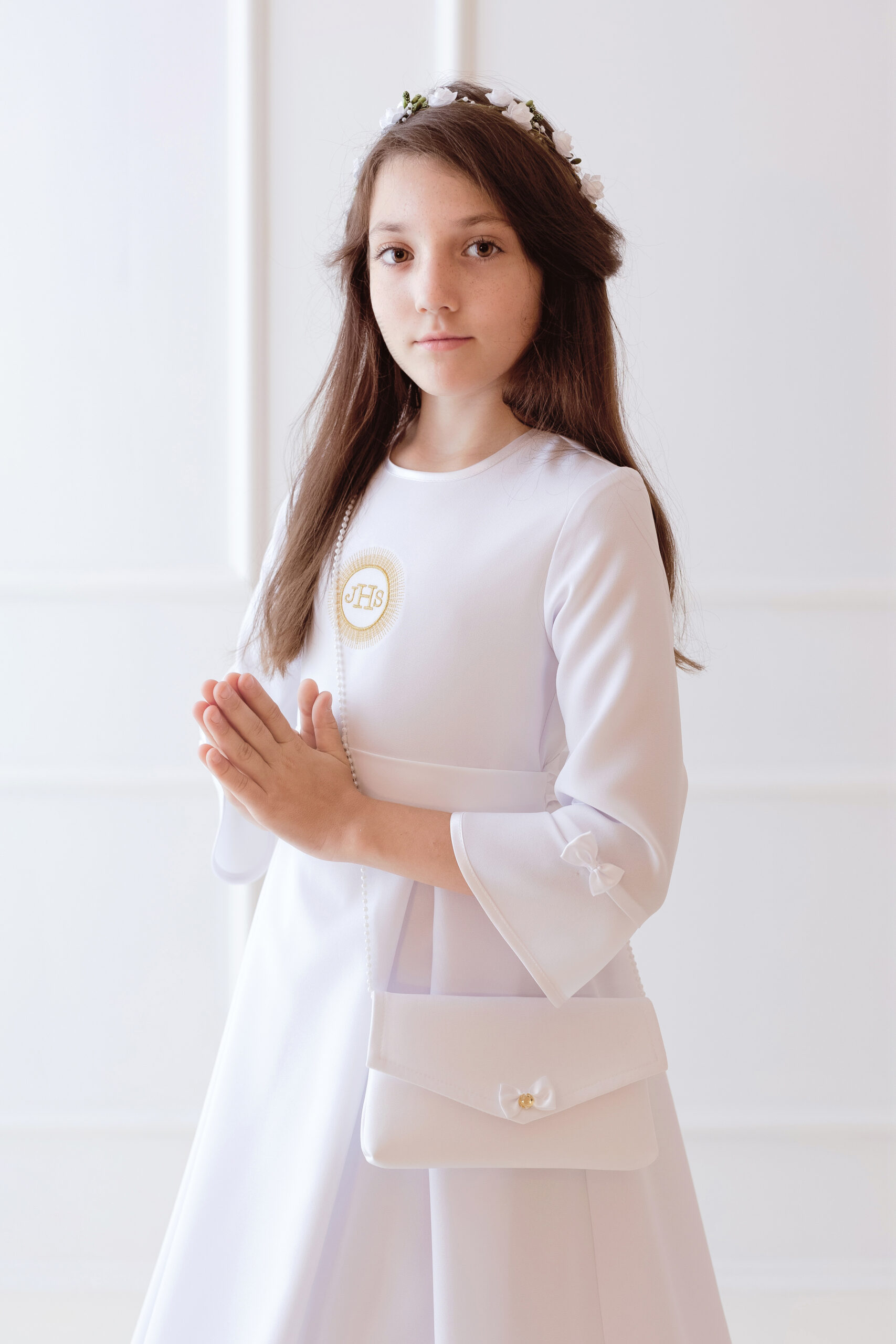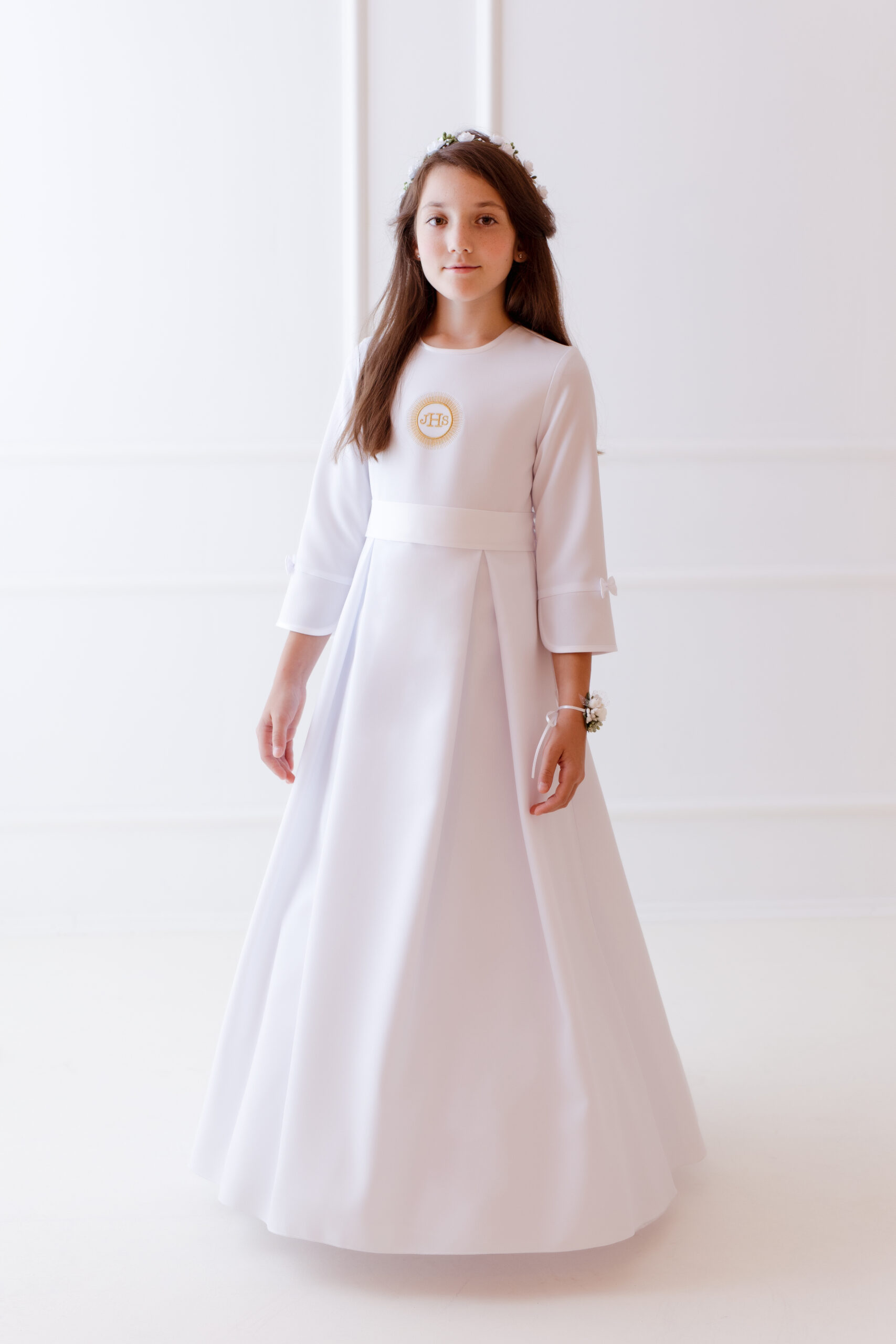 Prosta, elegancka sukienka odcinana w pasie, dół delikatne zakładki. Z tyłu pasek satynowy do wywiązania na kokardę. Halka z tiulem wszyta od pasa (z możliwością włożenia koła). Góra sukienki z wyhaftowaną hostią w kolorze srebrnym lub złotym. Pod sukienkę sugerujemy założyć podkoszulek na cienkie ramiączka. Tkanina stretch, pasek z satyny.