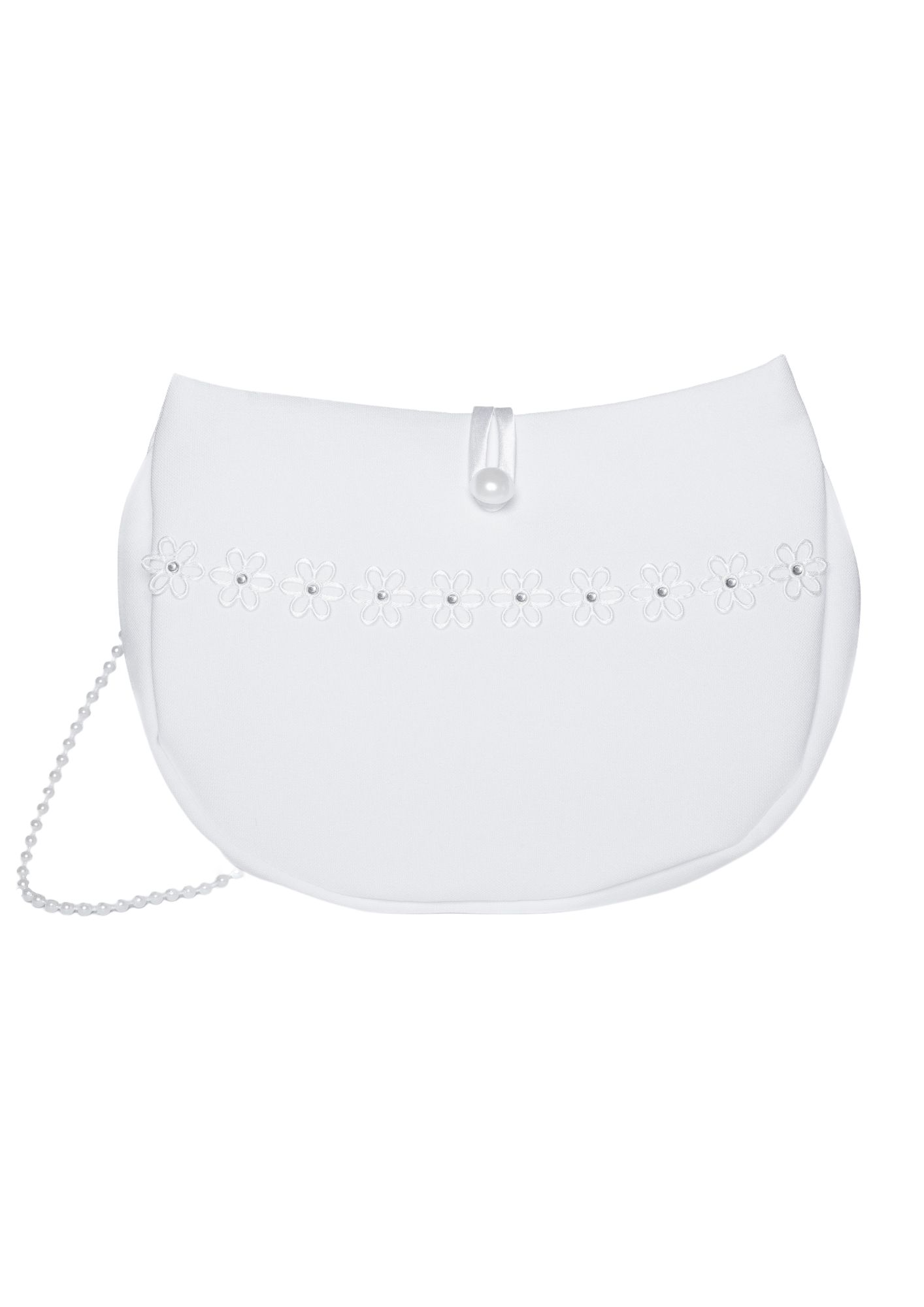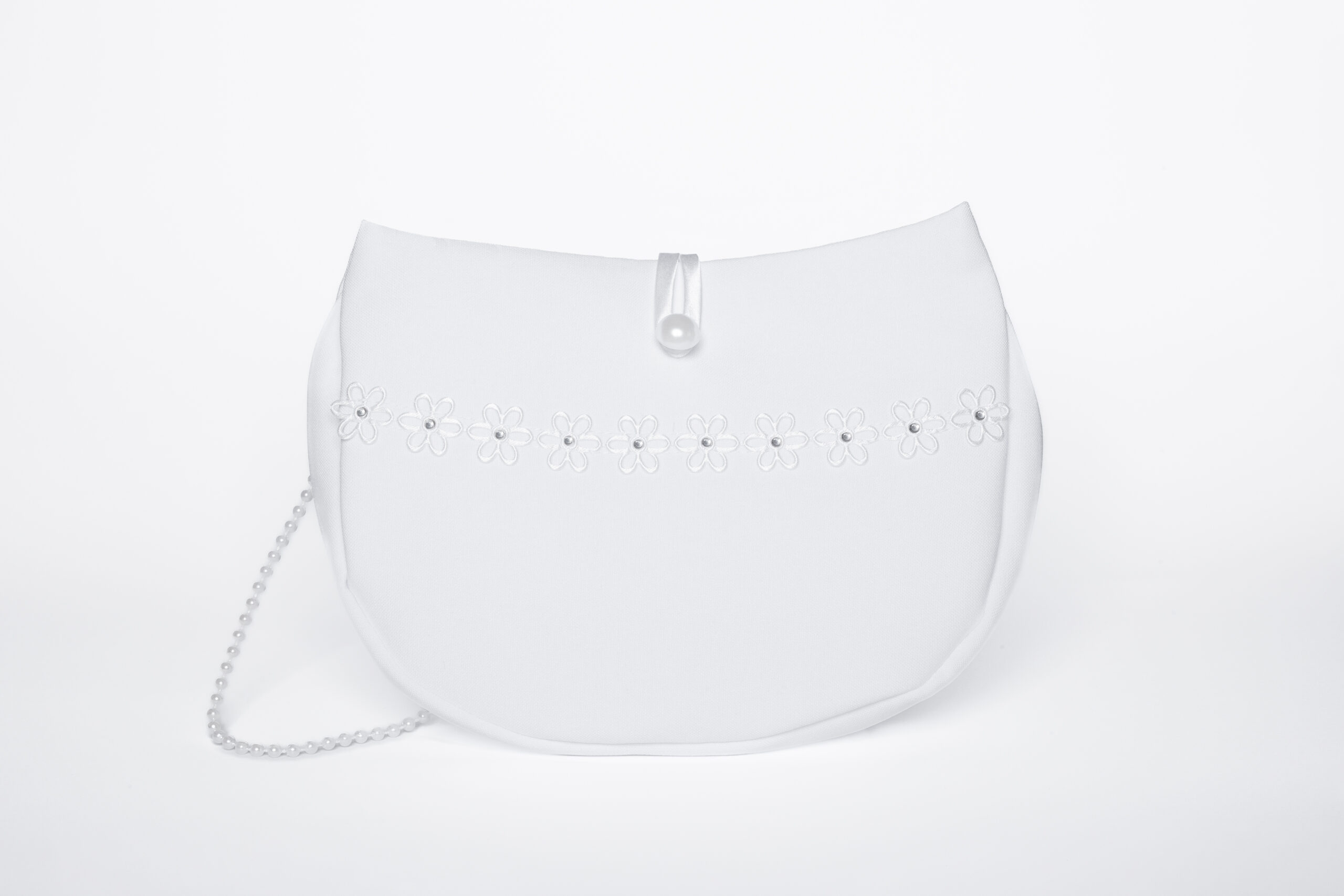 Torebka uszyta jest ze śnieżnobiałej tkaniny albowej, jest zapinana na guzik.